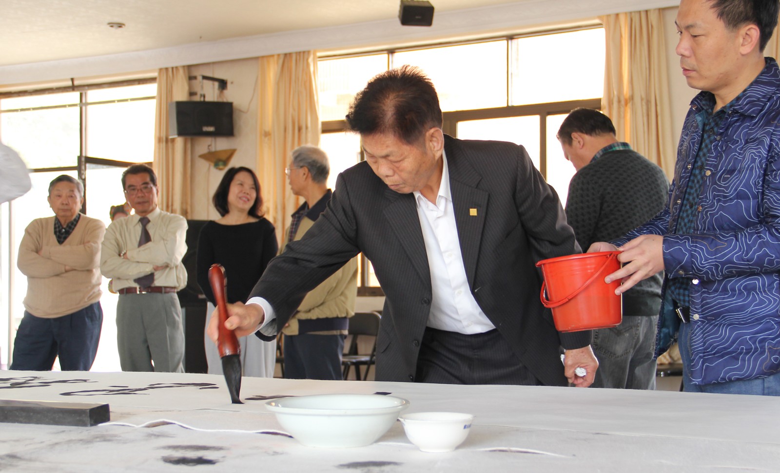 活動(dòng)首先由洪董事長(zhǎng)開(kāi)筆寫下“兩岸一家親 翰墨傳真情”拉開(kāi)序幕。接著,臺(tái)灣書法家粘文意以“大漢天意之融”表達(dá)兩岸情感。隨后,各書法家紛紛上陣,現(xiàn)場(chǎng)題字作畫,以墨寶互相交流,共同弘揚(yáng)中華傳統(tǒng)文化。許海泉現(xiàn)場(chǎng)書寫的“春華秋實(shí)”下筆如神,揮灑自如;丁文界的“海納百川”自然流暢,氣勢(shì)如虹。不一會(huì)功夫,“一脈相承,兩岸同光”、“源遠(yuǎn)流長(zhǎng)”、“豁達(dá)”、“惠風(fēng)和暢”、“翰墨情緣”、“觀海聽(tīng)濤”等作品躍然紙上。大家相互欣賞交流,氣氛歡樂(lè)和諧,彰顯文化自信。在眾人期盼中,洪董事長(zhǎng)以特大號(hào)毛筆書寫“仁義禮智信、情滿崇晉”巨幅書法,底蘊(yùn)深厚,大氣磅礴,獲得滿堂喝彩,將筆會(huì)推向高潮。